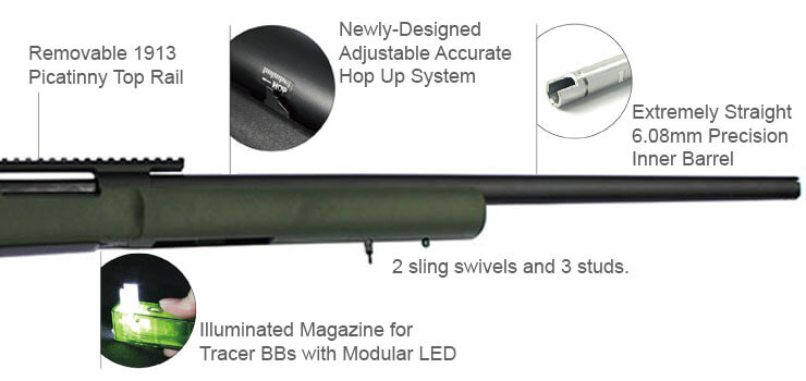 The Modify Bolt Action Air Rifle MOD24 is built for shot-to-shot consistency and reliability of accuracy. The Modify MOD24 improves all-round an airsoft sniper's skills, by offering upgraded flexibility and hit rate with the newly-designed, adjustable, accurate Hop Up; a wider, adjustable, textured trigger; a removable Picatinny top rail for mounting sights; 2 sling swivels and 3 studs; adjustable Butt Stock; a steel cylinder and strengthened metallic internal parts. Its field credentials are complemented with a non-glare, non-reflective finish for better camouflage.